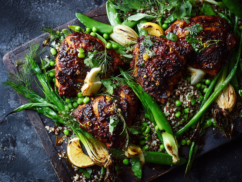 Crispy-skinned chicken thighs over creamy white beans, topped with a bright, garlicky ramp salsa verde. Served with roasted asparagus and a shaved radish and snap pea salad with mint. The kind of dinner that tastes like spring actually showed up.